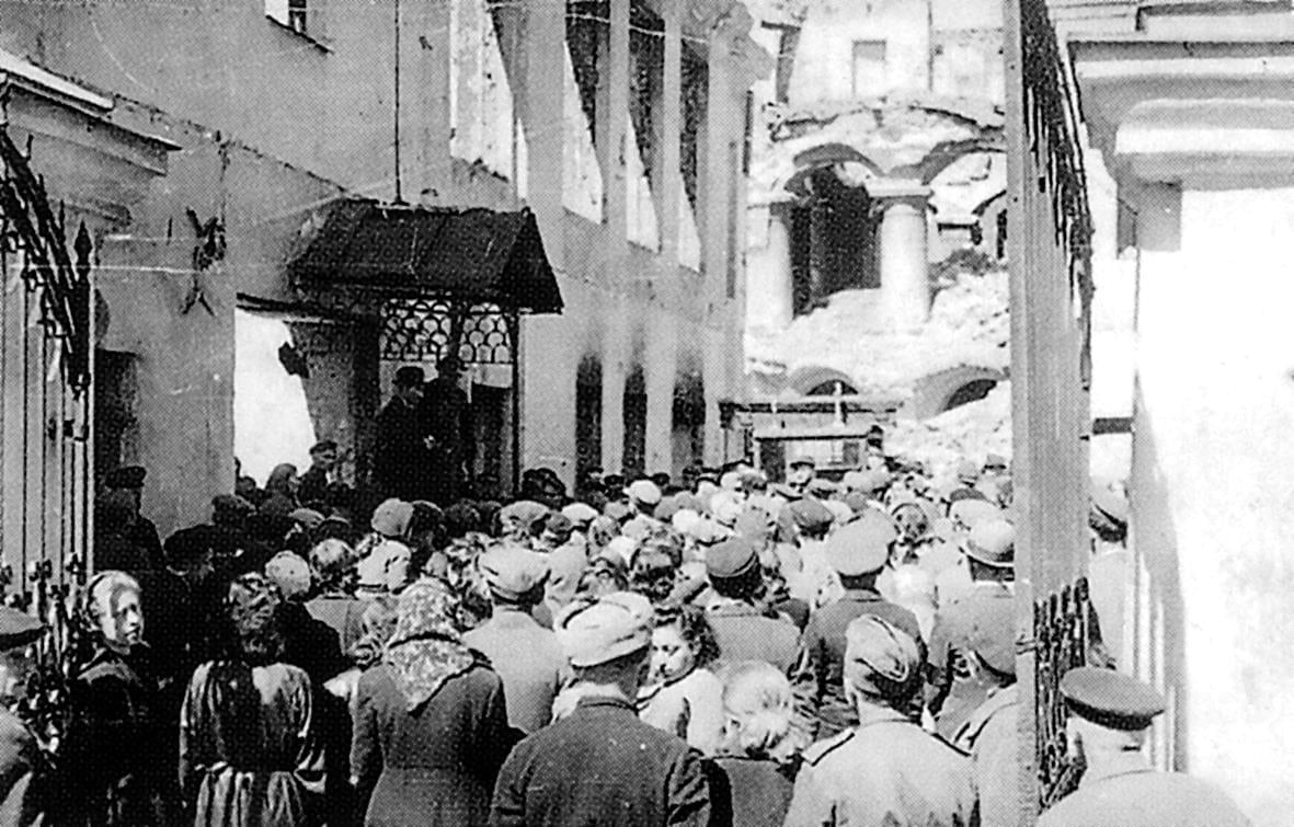 "Šulhoifas". Žydai prie Gaono kloizo (kairėje) laiptų susirinko į paniekintos Toros ryšulėlių laidotuves. XX a. 5-ojo dešimtmečio pabaiga.