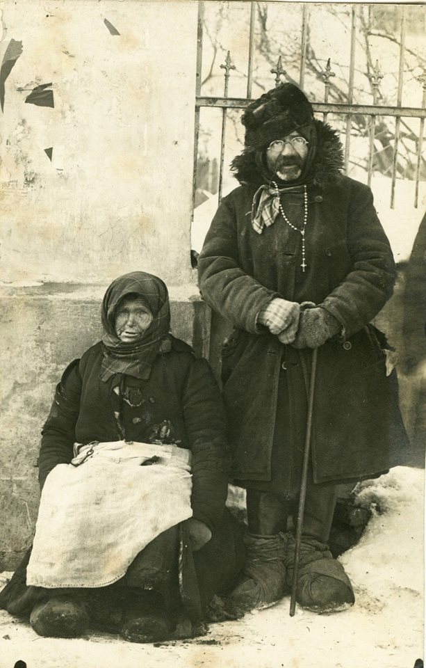 Vilniaus elgetų pora priešais bažnyčios vartus. Apie 1915 -1918 m.